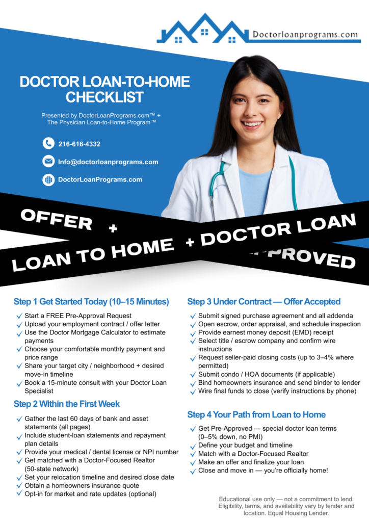 Step-by-step checklist created specifically for physicians to plan, apply, and close on a physician home loan smoothly.